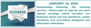 Annual Business Meeting January 18, 2026 by Sue Lucas 01/18/2026: 12:15 pm - 1:15 pm Contact Sue Lucas for more information. N/A
