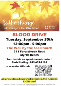 Blood Drive September 30, 2025 by Sue Lucas 09/30/2025: 12:00 pm - 5:00 pm Contact Sue Lucas for more information. N/A To schedule an appointment call Barbara Sterling at 843-655-7105