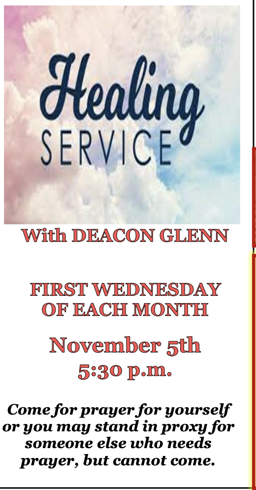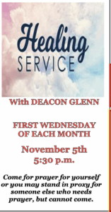 Healing Service with Deacon Glenn November 5, 2025 by Sue Lucas 11/05/2025: 5:30 pm - 7:00 pm Contact Sue Lucas for more information. N/A